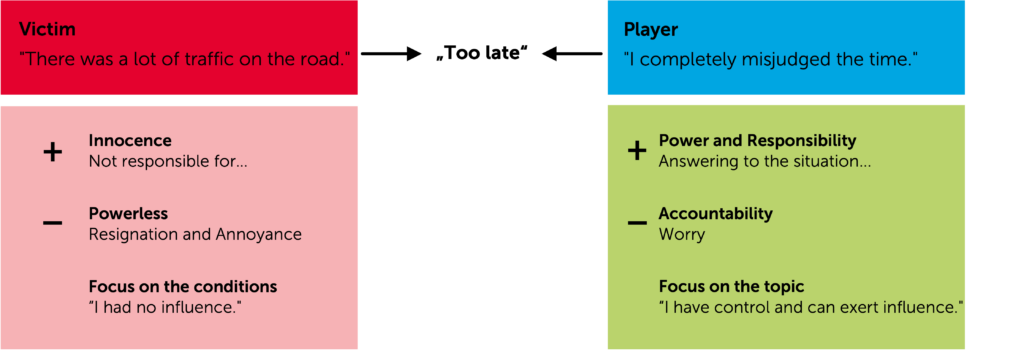An inner “victim mindset” means looking externally for reasons why something didn’t work out. For example, getting to work on time. One refers, for example, to the heavy traffic. Thus, one is not to blame. This feels pretty good in the first moment. But it also means that you can’t change anything. In a “responsible” attitude you check what your own part in it is and therefore you have the possibility to change something. In this example, you listen to the traffic radio in the morning and can better estimate the travel time.